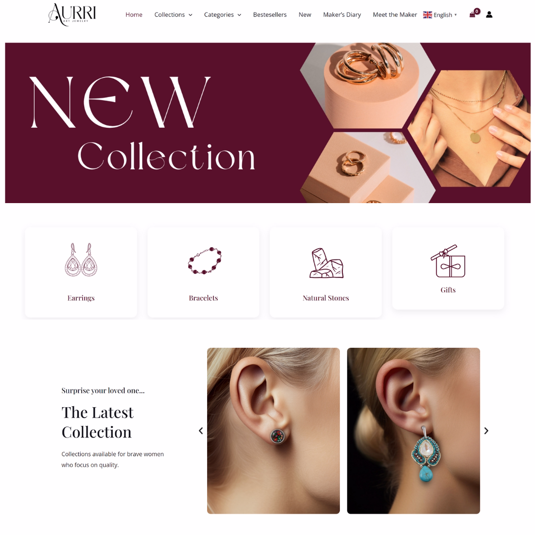 Aurri Art Jewelry zyskała spójną, luksusową identyfikację wizualną, która natychmiast przyciąga wzrok i uzasadnia cenę produktów Premium. Marka posiada teraz wydajny sklep online z optymalizacją UX, umożliwiający skalowanie sprzedaży i docieranie do klientów na całym świecie.