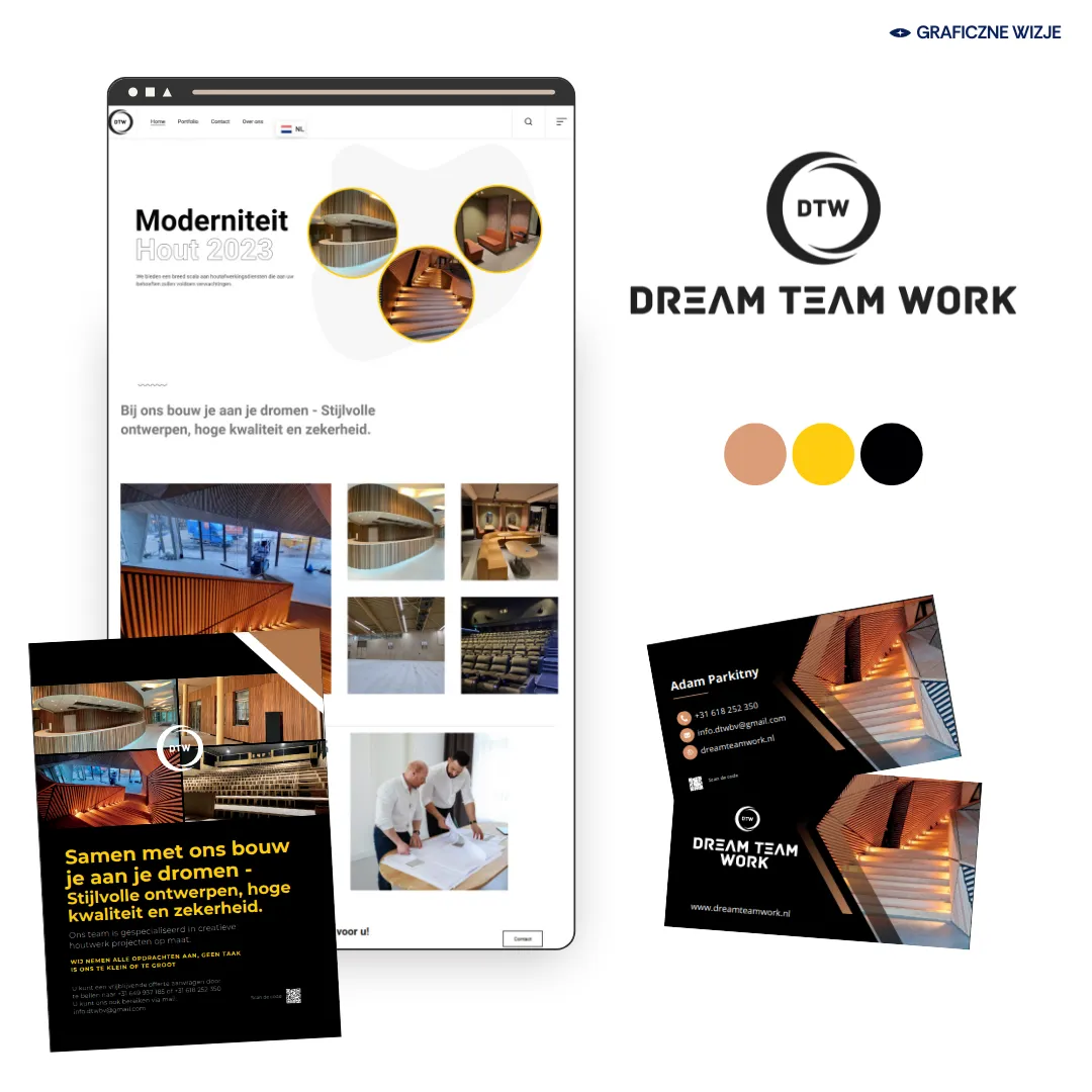 Firma Dream Team Work, specjalizująca się w wykończeniach drewnianych najwyższej jakości [źródło: opis Klienta], potrzebowała wizerunku, który udźwignie prestiż ich pracy. Oferują nie tylko montaż, ale i doradztwo, renowacje oraz tworzenie elementów dekoracyjnych . Wyzwaniem było odejście od wizerunku „ekipy budowlanej” na rzecz Ekspertów i Doradców, których praca dodaje wnętrzom unikalnego uroku i wartości.