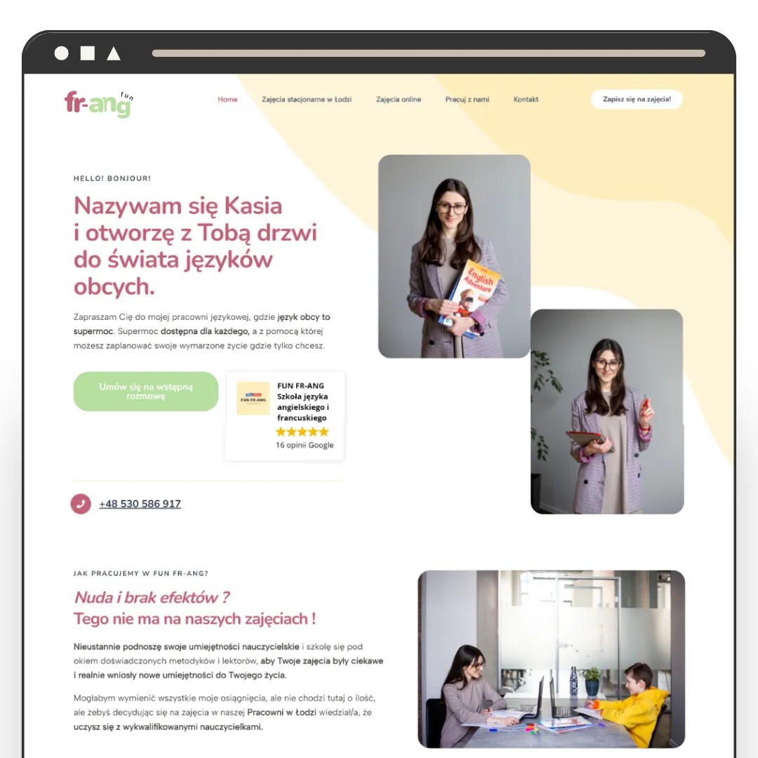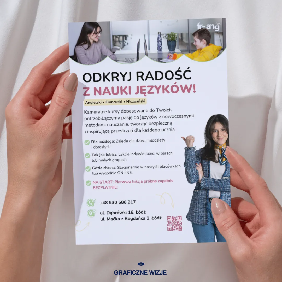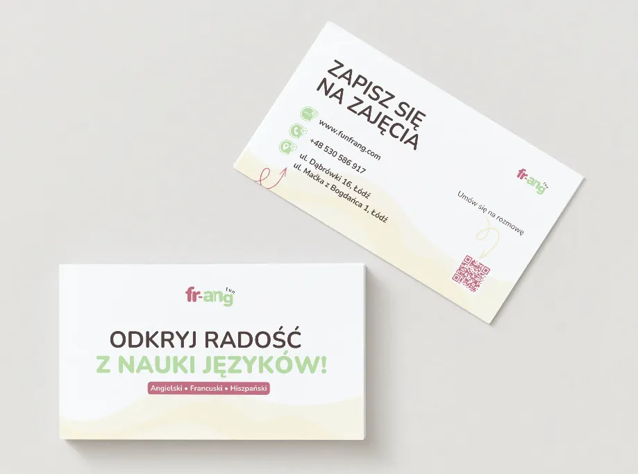 Fun FR-ANG zyskało silny, unikalny wizerunek, który zdominował lokalną konkurencję w Łodzi. Dzięki pełnej spójności (online & offline), szkoła stała się natychmiast rozpoznawalna dla mieszkańców. Jasny i atrakcyjny design przełożył się na profesjonalny odbiór marki, ułatwiając pozyskiwanie nowych kursantów w każdej grupie wiekowej – od dzieci po dorosłych.