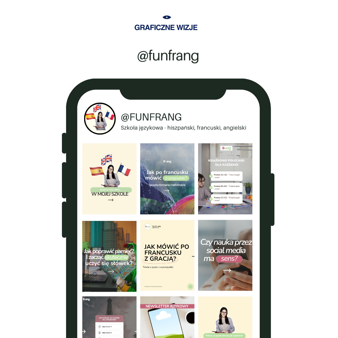 Stworzyłam przejrzystą stronę WWW, która intuicyjnie prowadzi kursanta przez ofertę trzech języków. Dodatkowo wdrożyłam system szablonów social media, dzięki którym komunikacja szkoły stała się estetyczna i uporządkowana.