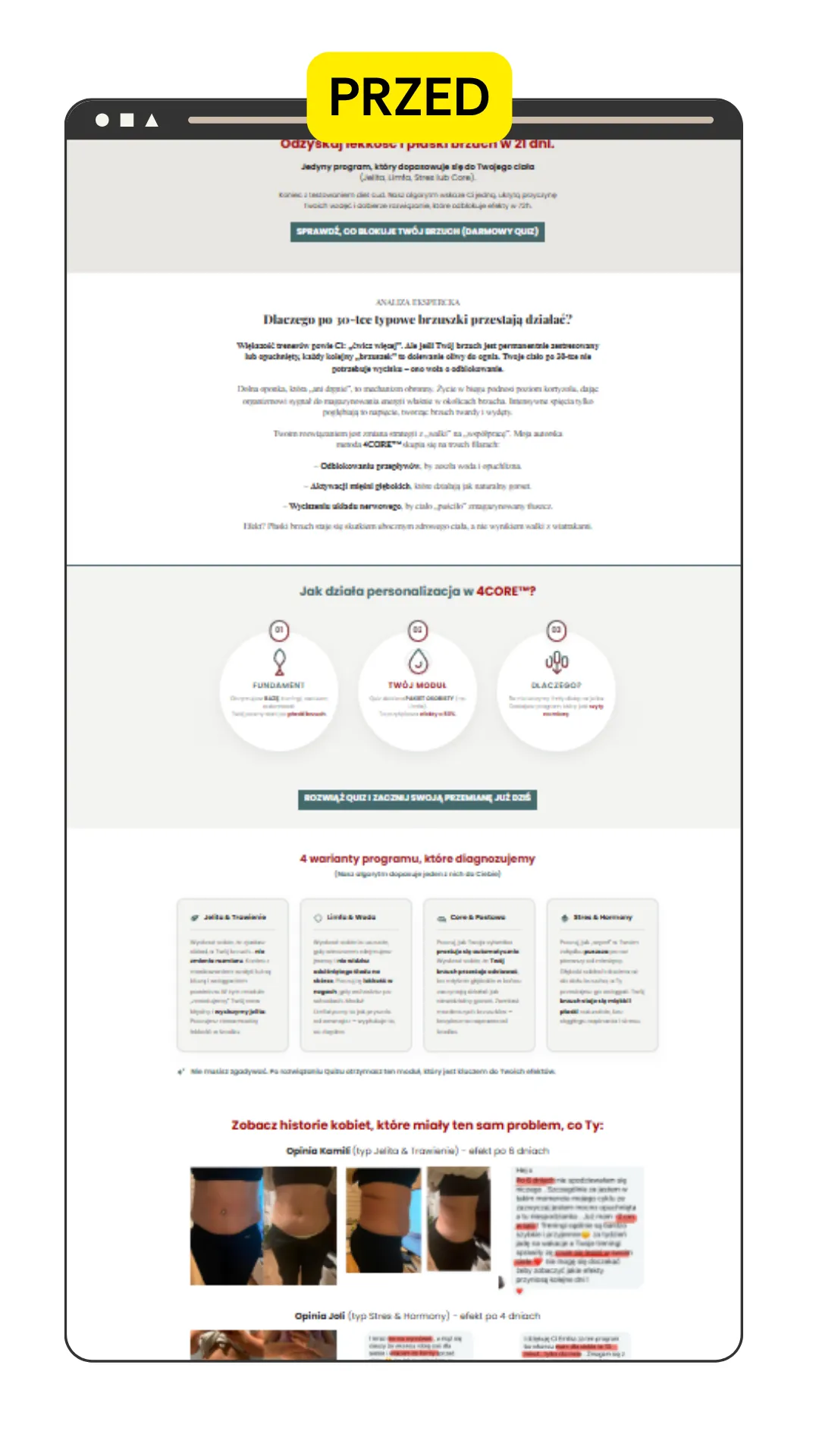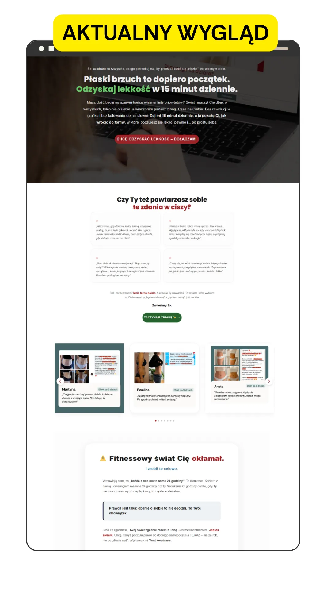 Emilia Wiktoruk, trenerka personalna działająca na rynku szweckim i polskim, posiadała stronę, która była zbyt spokojna, zachowawcza i wizualnie odstawała od energii, jaką Emilia wkłada w treningi. Stary landing page nie oddawał ducha spektakularnych przemian jej podopiecznych i nie rezonował z nowoczesną grupą docelową. Wyzwaniem było stworzenie strony, która będzie bić energią, motywować do działania i wyglądać jak produkt klasy Premium.