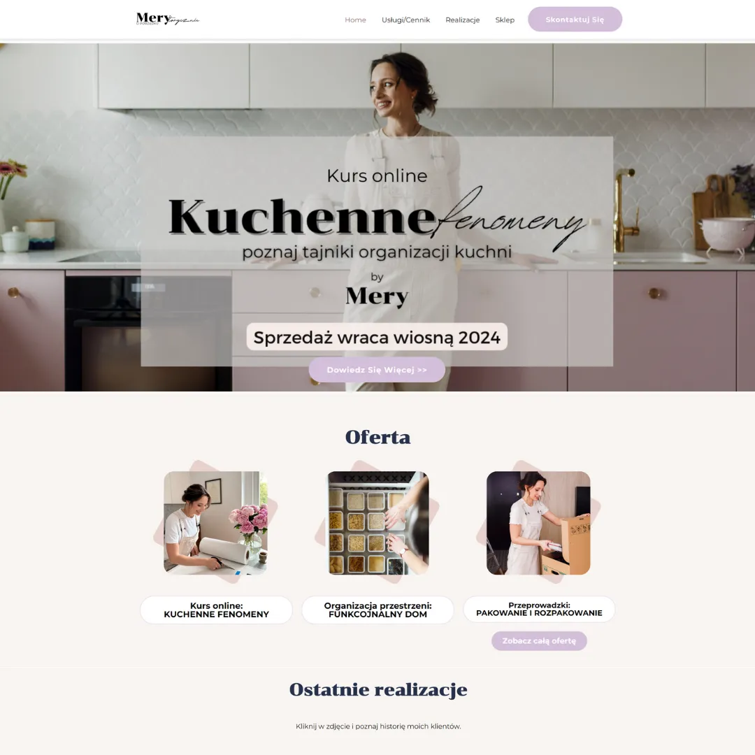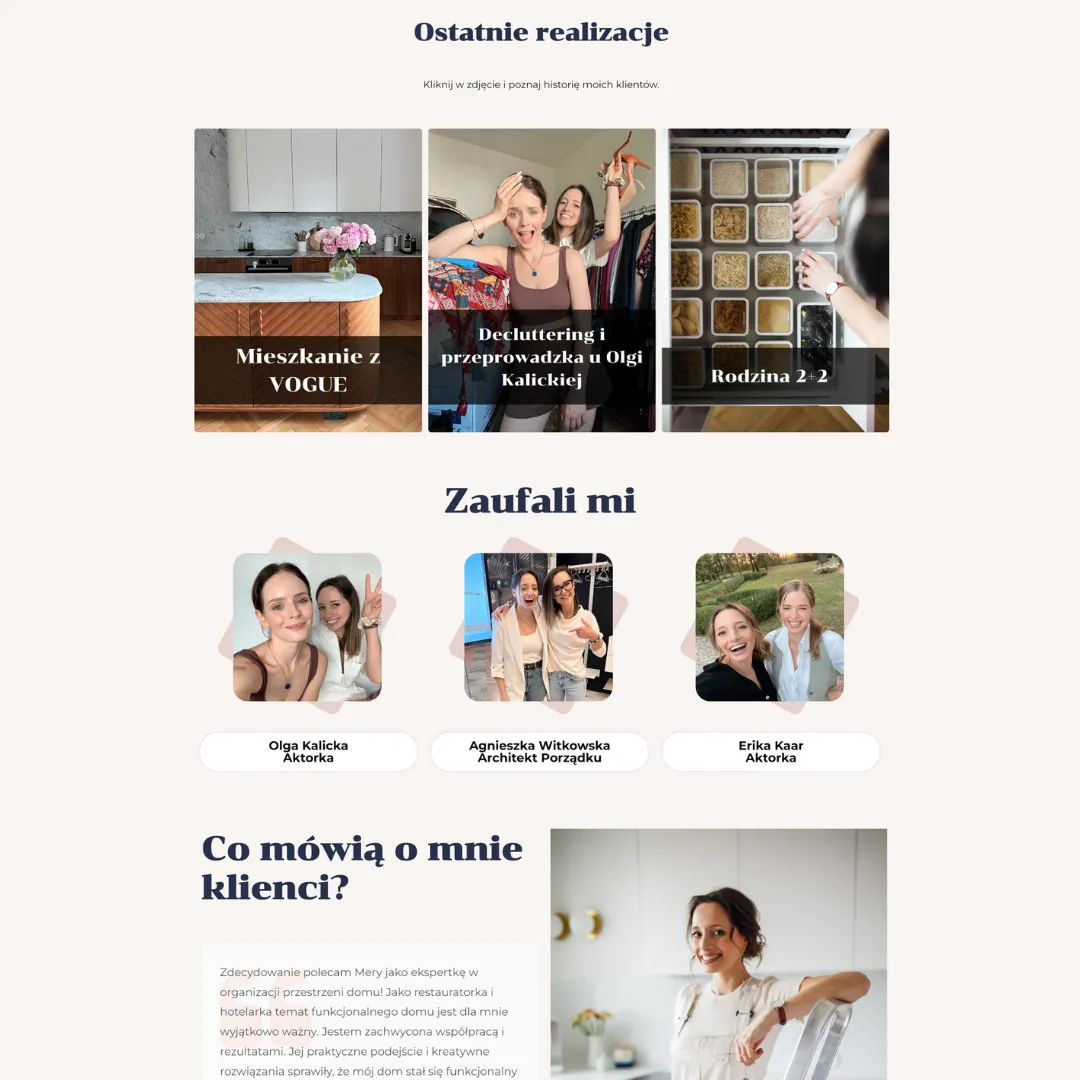 Mery Piotrowska – znana jako Organizatorka Przestrzeni GWIAZD oraz TV Host programu „Porządek musi być” w Canal+Polska – potrzebowała stworzenia wizerunku i platformy e-commerce, które odzwierciedlałyby jej medialny autorytet. Celem było profesjonalne przeniesienie jej ekspertyzy ze świata mediów do świata online, umożliwiające skalowanie usług (konsultacje, produkty) poprzez w pełni funkcjonalny sklep internetowy.